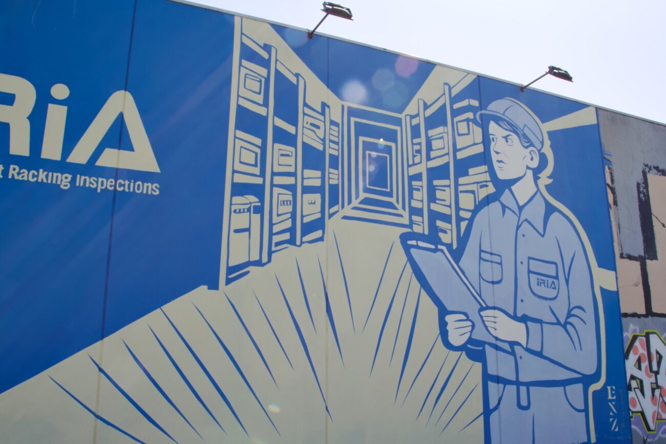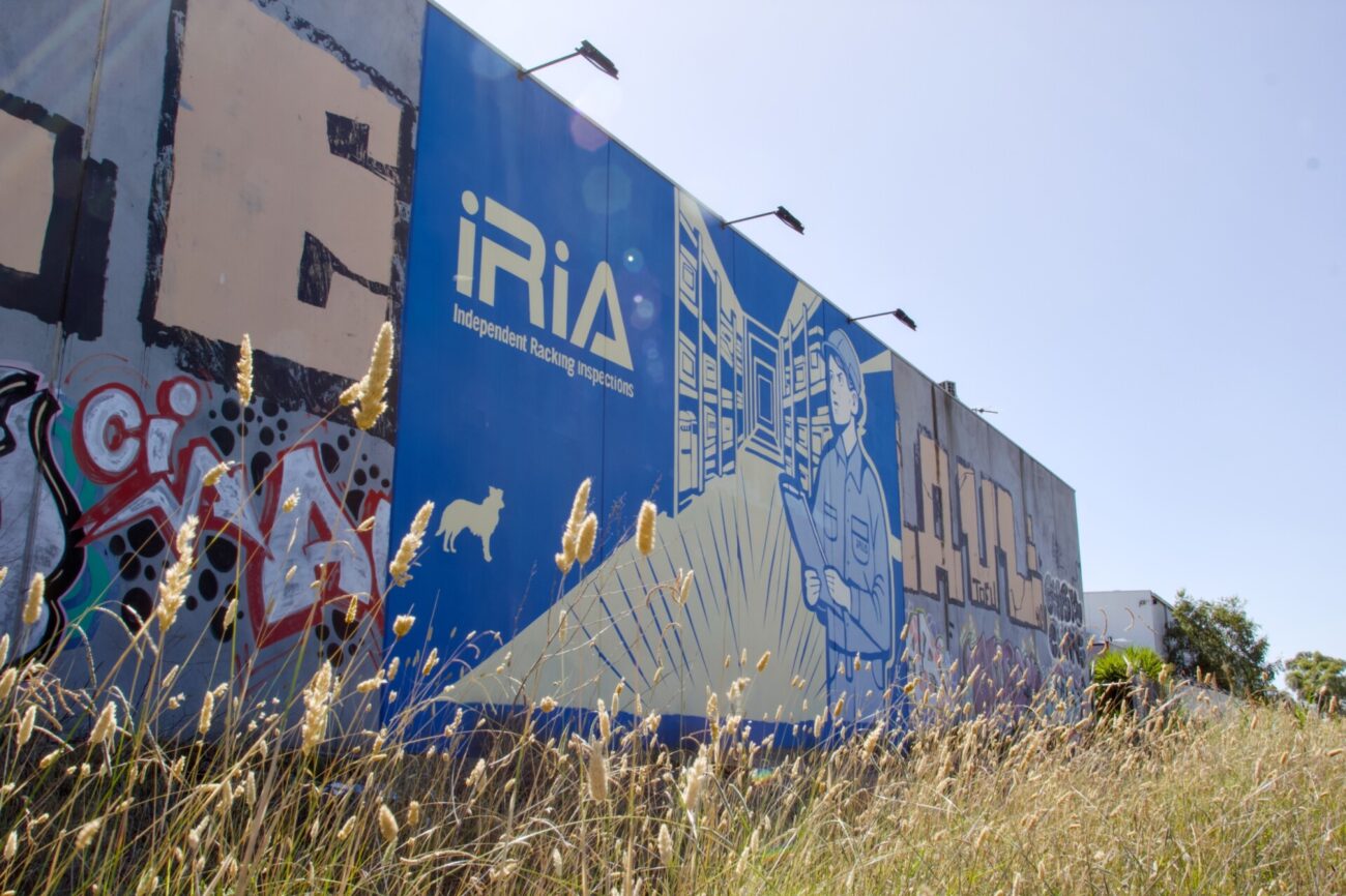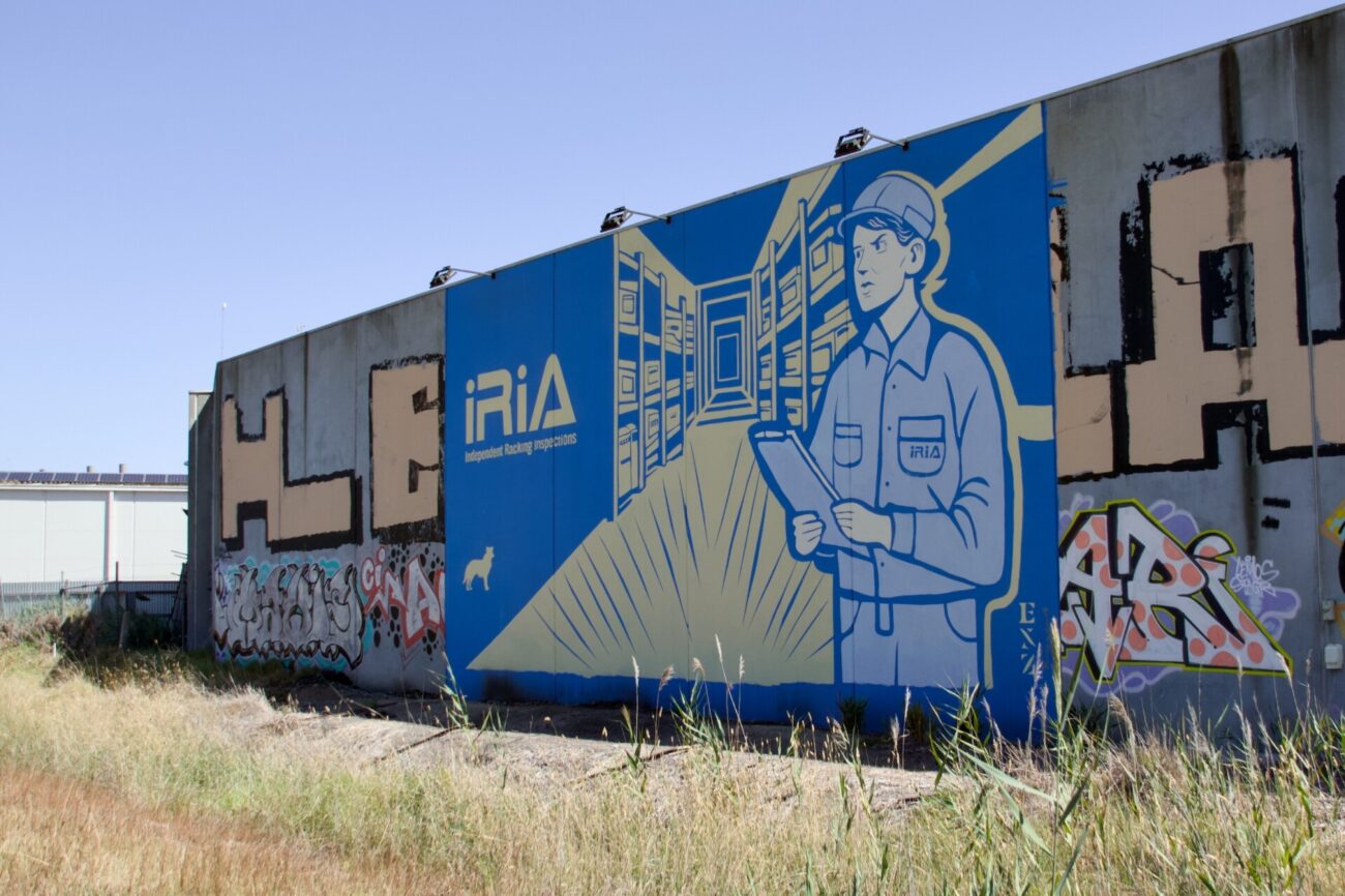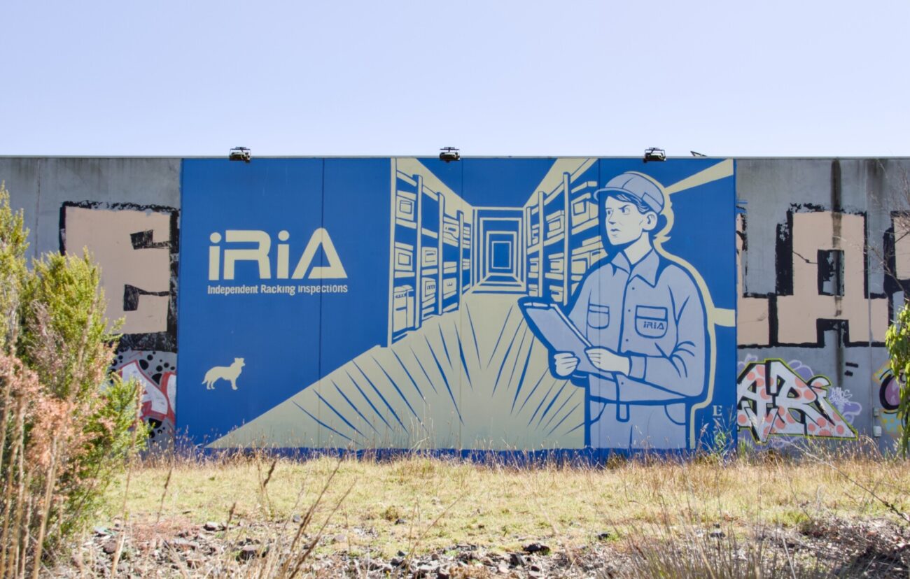 Commissioned by Independent Racking Inspections Australia (IRIA), this freeway-facing mural spans 10m W × 6m H, designed and executed. The composition balances bold typography with illustrative linework, anchoring IRIA’s brand presence at scale.
