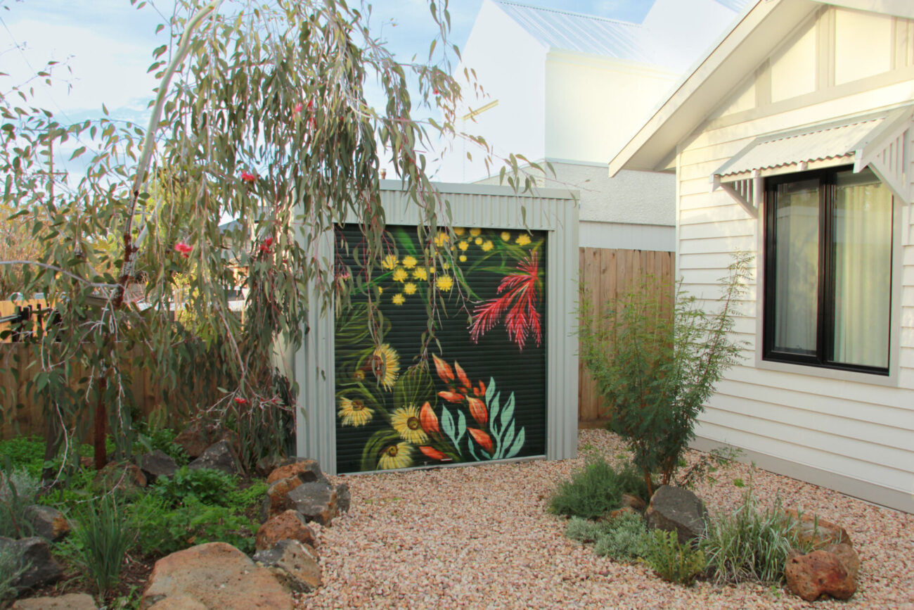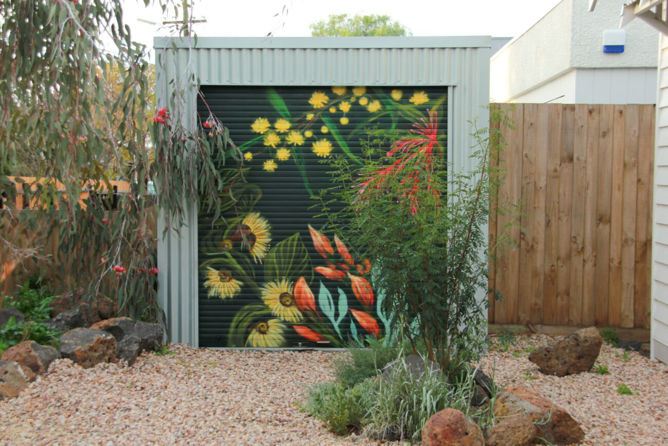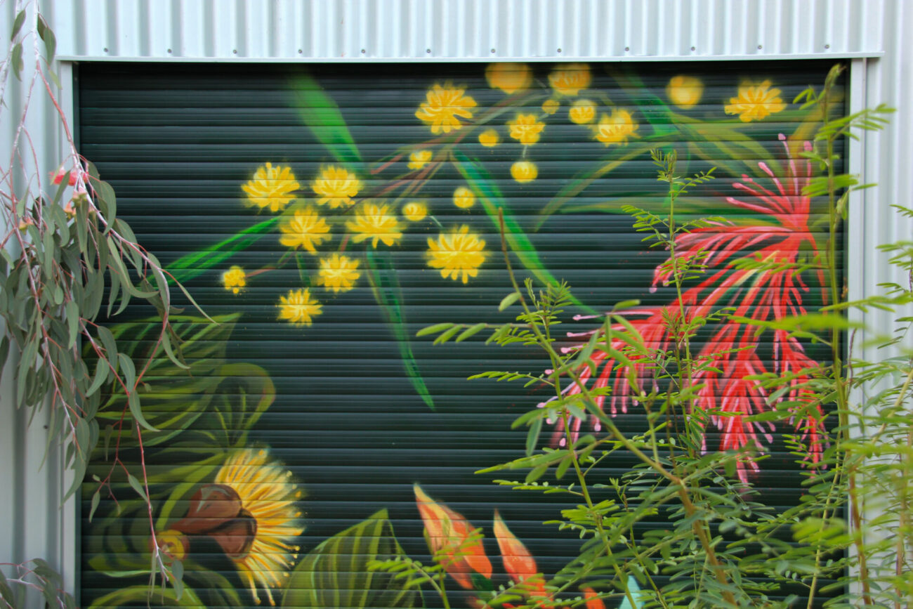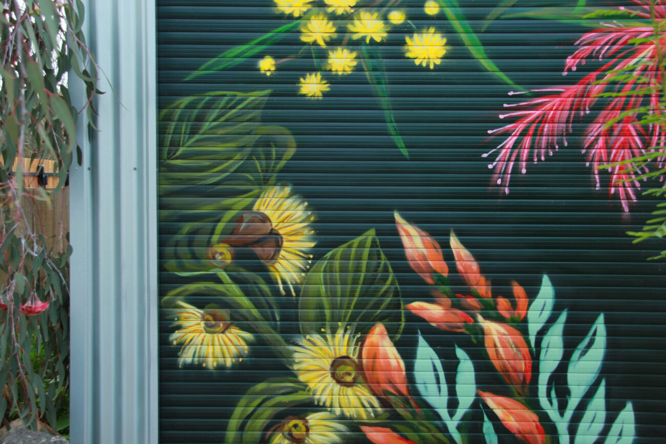 Spray paint mural of Australian native flora — Templetonia, Bottlebrush, Wattle, and Eucalyptus blooms. Painted to flow with the neighbouring Eucalyptus tree
