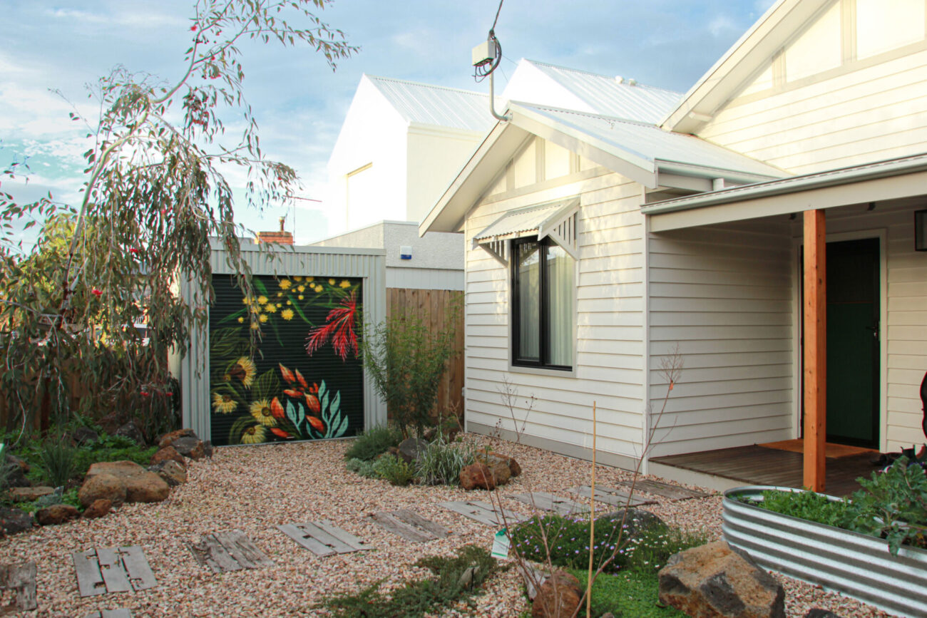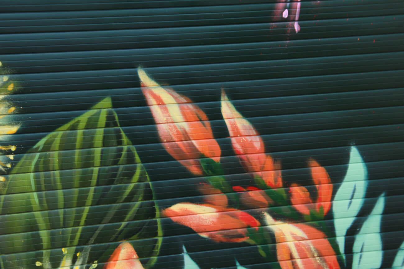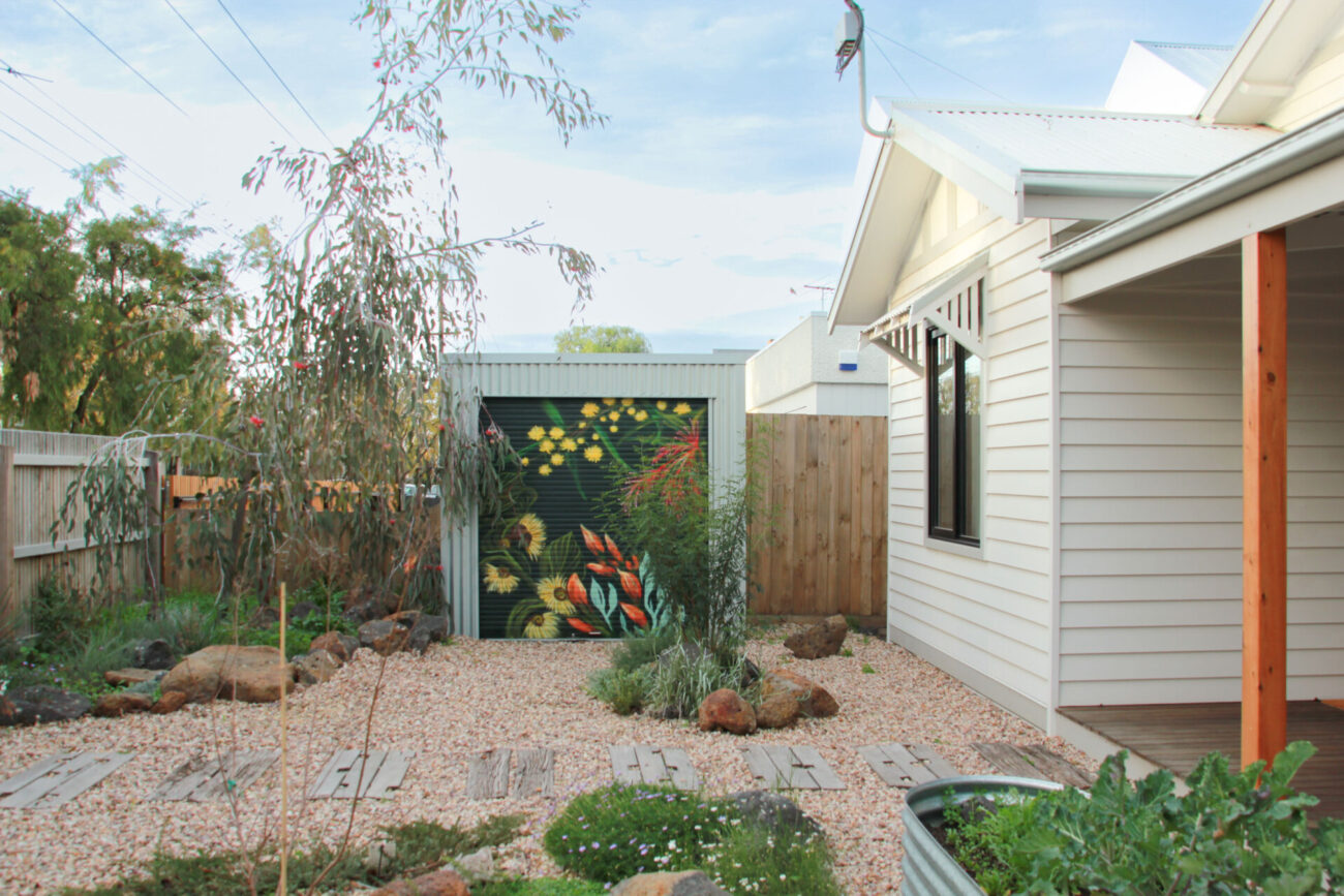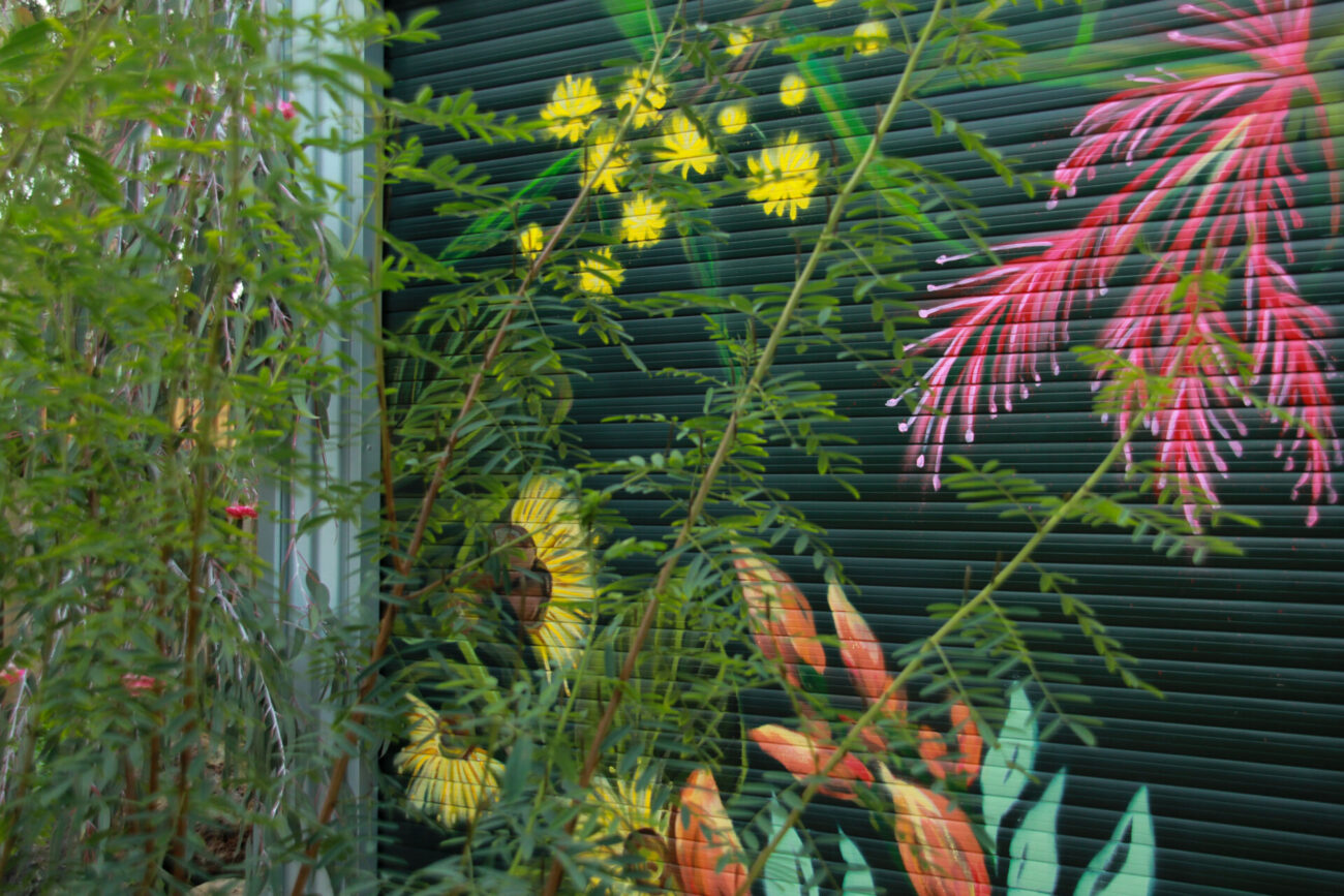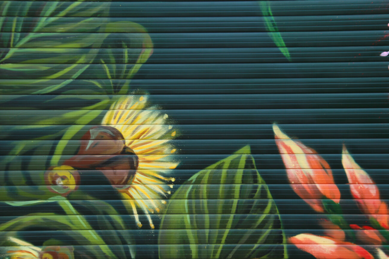Spray paint mural of Australian native flora — Templetonia, Bottlebrush, Wattle, and Eucalyptus blooms. Painted to flow with the neighbouring Eucalyptus tree